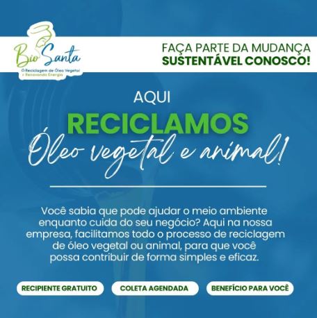 A Bio Santa é a sua parceira ideal para a gestão responsável do óleo vegetal, há 11 anos de atuação, somos referência em transformar um resíduo em produtos de alta qualidade, como biodiesel e insumos para diversas indústrias. Ao escolher a Bio Santa, você contribui para a redução da poluição, preserva recursos naturais e gera valor para o seu negócio. Atendemos Redes de Fast Food, Cozinhas Industriais, Bares e Restaurantes.